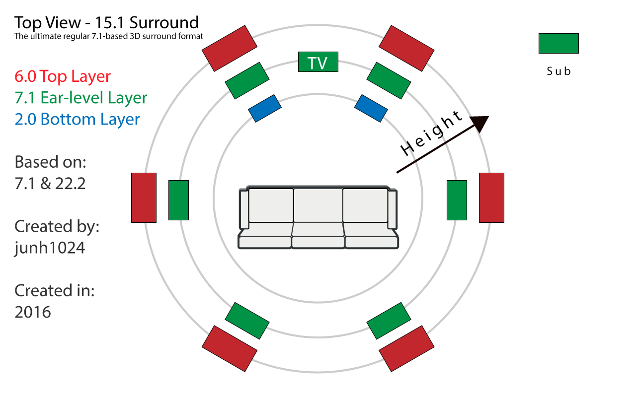 - 15.1 is HQ channel-based system for 3D surround, based on combining the best of NHK's 22.2, and 7.1 surround.
