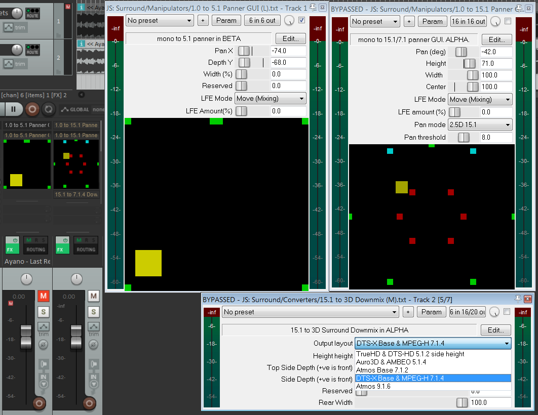 - If a 5.1 surround FX was selected previously, load another ReaJS, select "Multi Mix Convert (L).txt", and select 5.1 SMPTE input, 5.1 FILM output.
