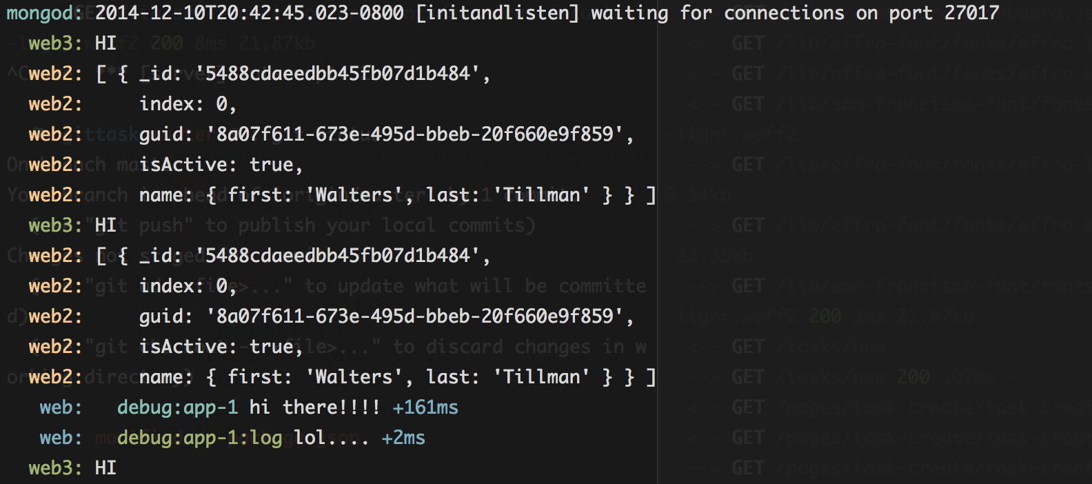 Node Foreman does a good job getting processes to run together. It does not do a good job with logging. Spacing gets trimmed, timestamps take up too much space, etc.