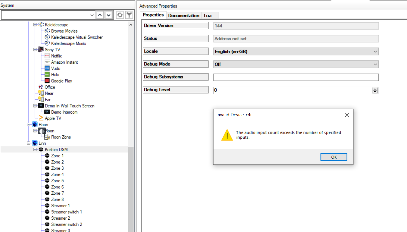 Within Composer you should be able to double click on the matrix driver and see a virtual matrix (as well as control the invidual zones volume etc...) but when you do you get an 'Invalid Device' error message with the further text "The audio input count exceeds the number of specified inputs".