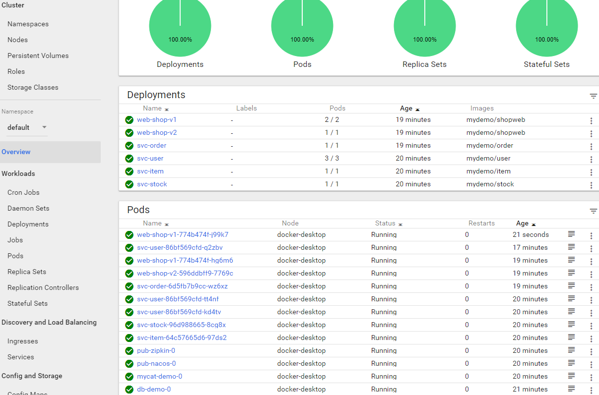 Dubbo服务支持K8s扩缩容(user-service默认部署了2个POD),可以尝试K8s管理(在Docker Desktop中shop-web不支持扩容,因为使用了NodePort):# 将user-service扩容到3个POD kubectl scale --replicas=3 -f deployment/svc-user-deployment.yaml # 扩容后可以开启3个窗口,监控user-service POD日志,查看负载均衡分配情况 # 1. 找出user-service的POD kubectl get pods | grep svc-user # 2. 监控每个POD中的容器日志(根据上面语句结果更换容器名称) kubectl logs svc-user-68ff844499-9zqf8 -c svc-user -f kubectl logs svc-user-68ff844499-dgsnx -c svc-user -f ...