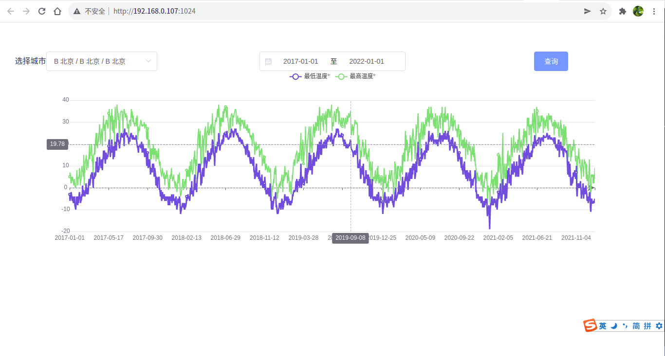 这是一个可视化中国各地区历年(2011年~)历史天气状况的项目,基本涵盖中国绝大部分地区(包括港澳台及钓鱼岛等地区)。这个项目由笔者之前科研过程中的小成果衍生而来。因之前研究需要用到历史天气数据,因此笔者专门写了个爬虫爬取http://tianqi.2345.com 这个网站的历史天气数据。一方面是为了做个小项目练练手,一方面也是为了方便其他有需要的童鞋,笔者花了一周的时间将其做成了web系统,前后端分离开发。为了方便使用,笔者将其做成了docker镜像并上传到了阿里云,用户只需要两条命令即可运行。