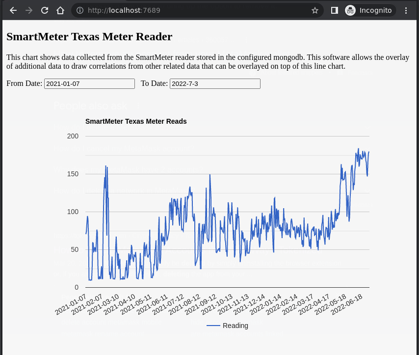 I created this as a means to collect and store data longer than the two years SMTX stores data. In this way, you can have this in your local database and render charts and graphs no matter who your electric provider is. If you live in Texas, you know how challenging it can be searching for a new provider every couple of months to annually and not having clear access to your electric usage history.