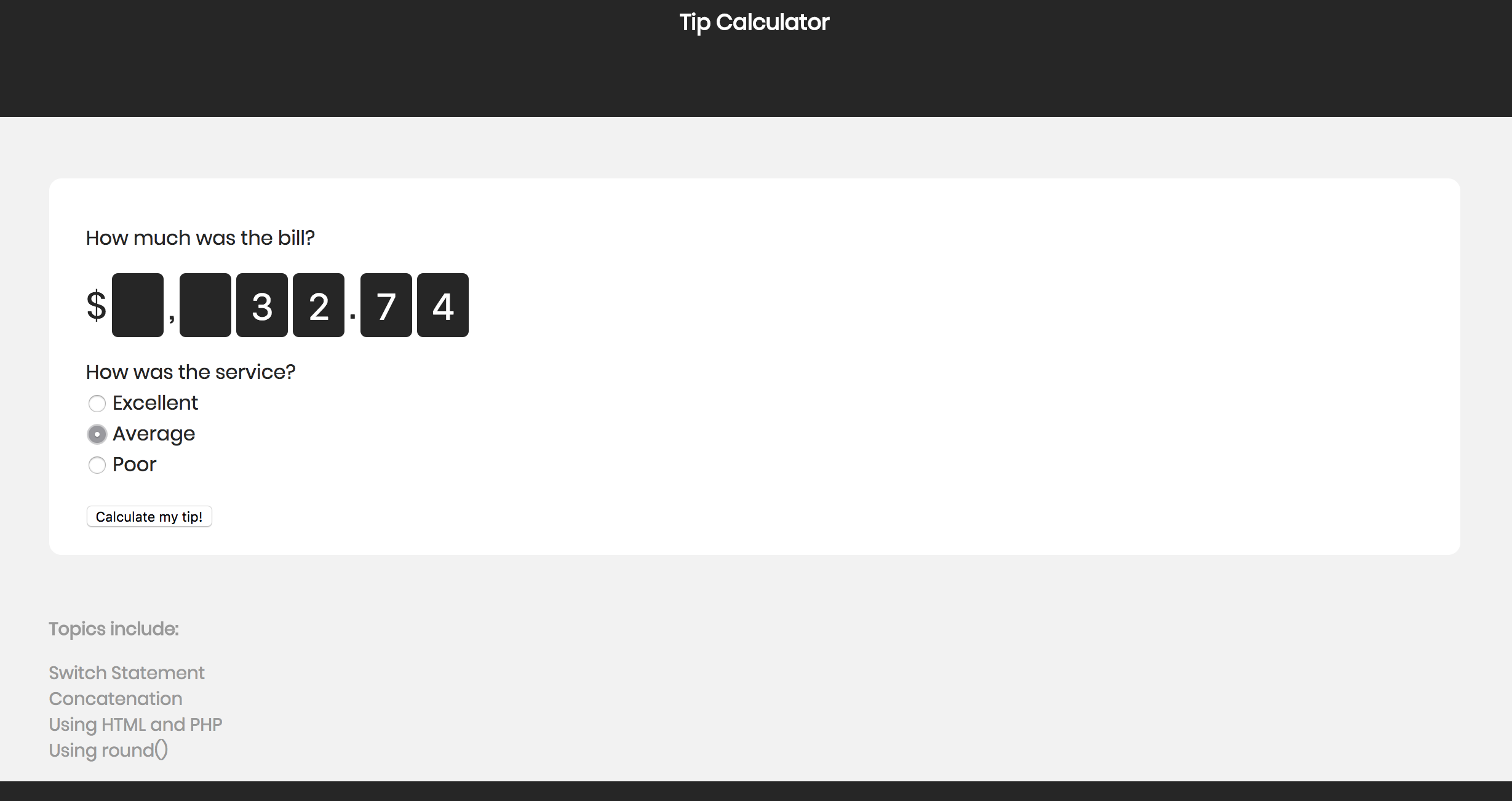 Tip Calculator with PHP Used a switch statement and round() to create a simple tip calculator for the user Getting started I used my localhost with MAMP to test this project, since PHP runs on a server View project Start - Screenshot of form page End - Screenshot of confirmation/results