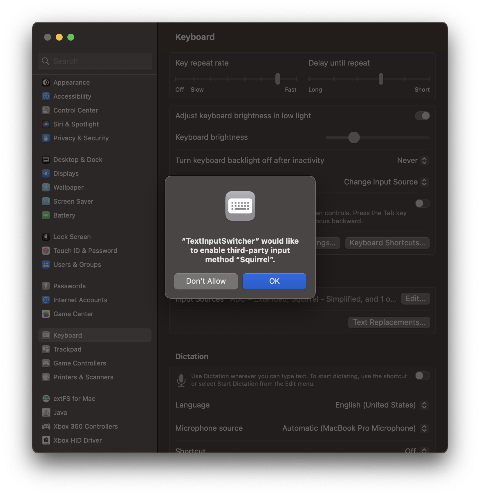 Unable to use the Squirrel after the update is completed (on macOS Ventura). Every time I switched to the Squirrel, there is a system dialog (attached below) popped up; and I was not to able use it even after restart. However, this problem can be resolved by reinstall the Squirrel. Why? |