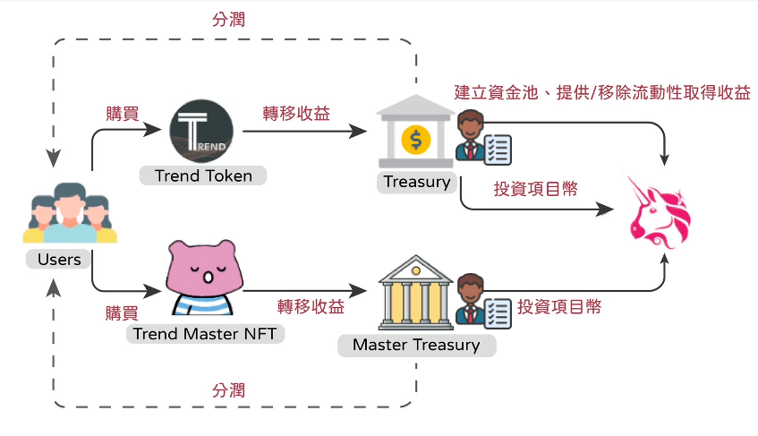 Trend DAO 是一個去中心化的基金,投資者只要購買Trend Token或Trend Master NFT即可參與項目未來獲利分潤。購買Trend Token將可以分取Treasury收益,而購買Trend Master將可以分取Master Treasury的收益。而收益來源皆來自對Uniswap v2上項目幣的投資或資金池收益。