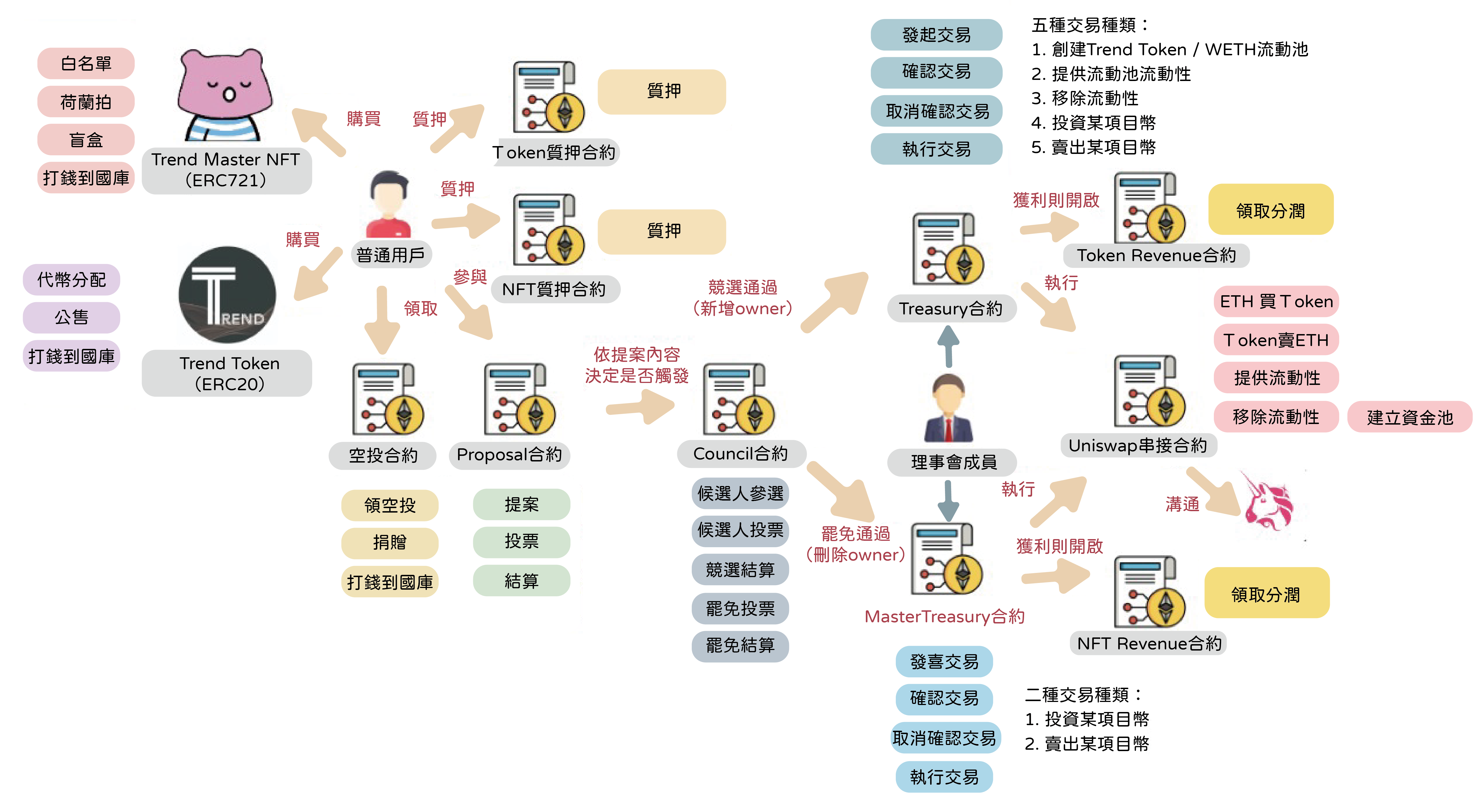 - 七、智能合約互動及重點功能示意圖