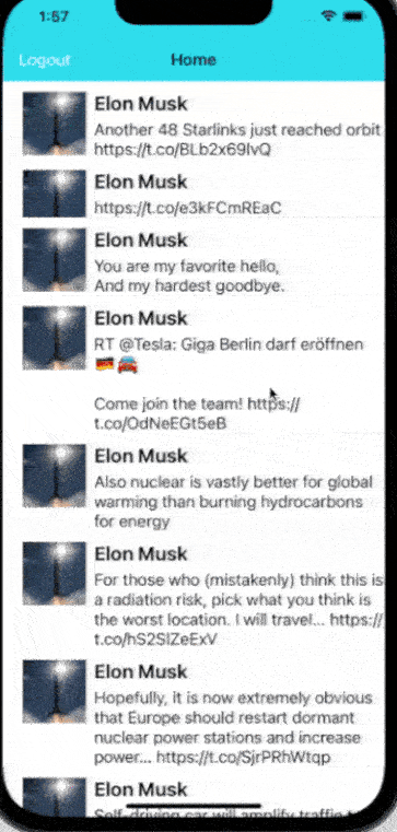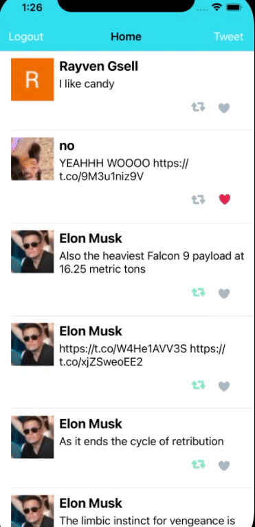 - User can view tweets with the user profile picture, username, and tweet text. (6pts)