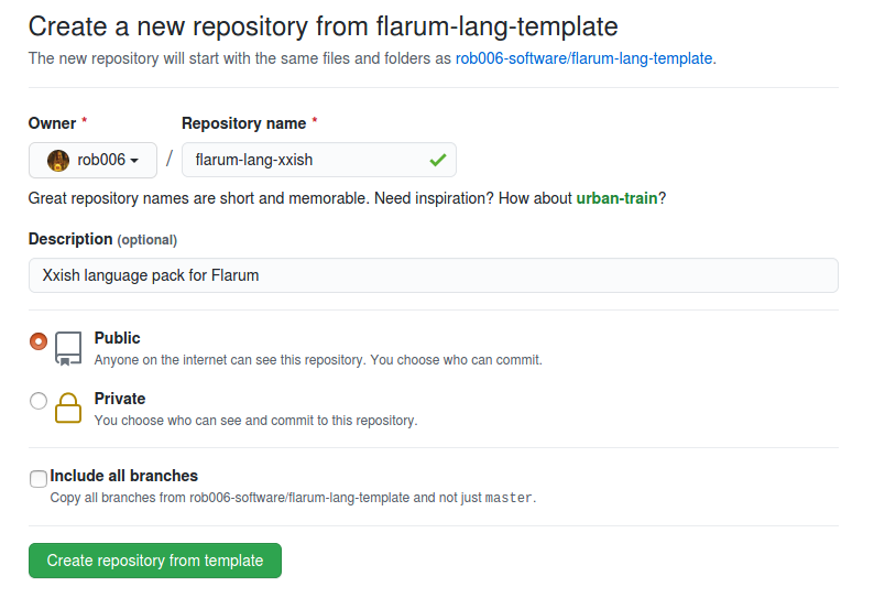 As repository name you can use format flarum-lang-xxish, where xxish is textual name of your language (like "polish" or "english"). Make sure that your repository is public, so other people will be able to use your package.