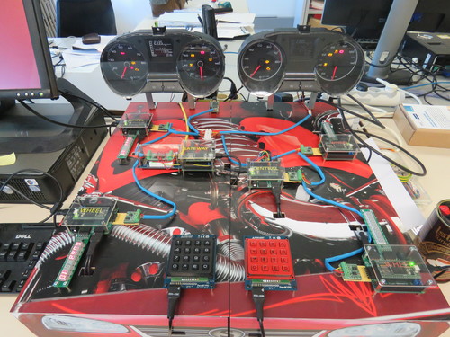 vulcan/bench$ make mac LIBVULCAN=leia # or choose LIBVULCAN=vaticanTo evaluate the VulCAN approach in terms of performance overhead, we constructed a testbench where we interfaced Sancus-enabled FPGAs with real CAN transceiver hardware. Our prototype setup features multiple Xess XuLA2-LX25 Spartan-6 FPGAs, each synthesized with a Sancus-enabled OpenMSP430 core, and each connected to an off-the-shelf Modtronix im1CAN SPI CAN bus peripheral module using the popular Microchip MCP2515 CAN transceiver chip.