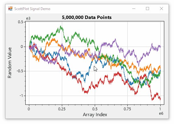 | stretchy line plot In this demo some random points are generated and scrolled (similar to numpy's roll method). Although the result looks simple, there is some strong thought behind how this example is coded. All the graphing code is encapsulated by the ScottPlot class of swhPlot.cs. The code of the GUI itself Form1.cs is virtually empty. My thinking is that from here I'll work on the graphing class, keeping gui usage as simple as possible. Note: plotting 321 data points I'm getting about 300Hz drawing rate with anti-aliasing off and 100Hz with it on | ![]() |