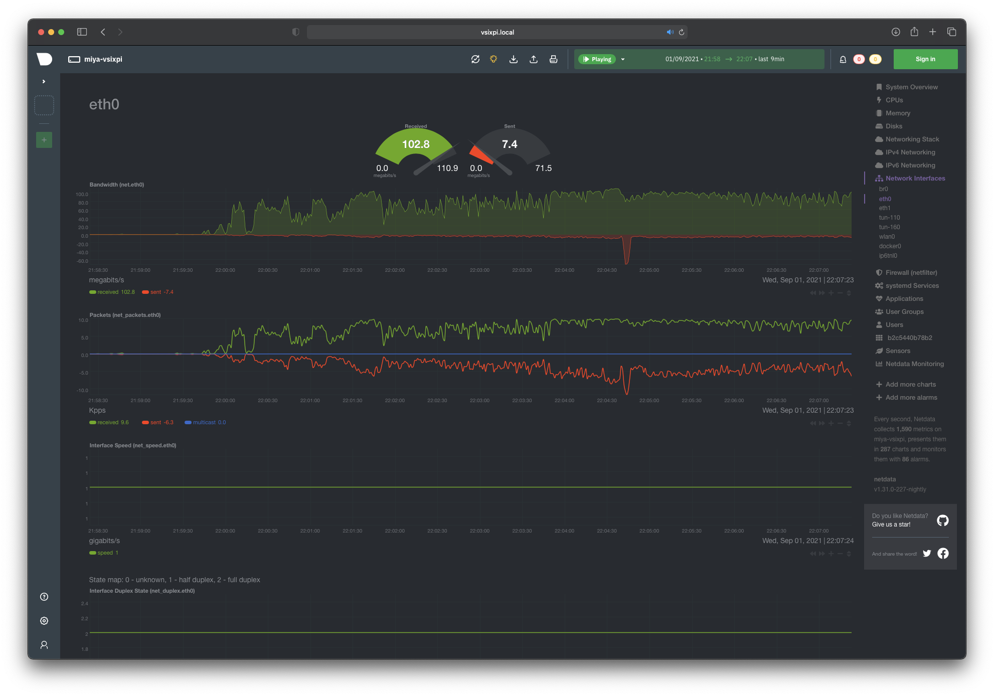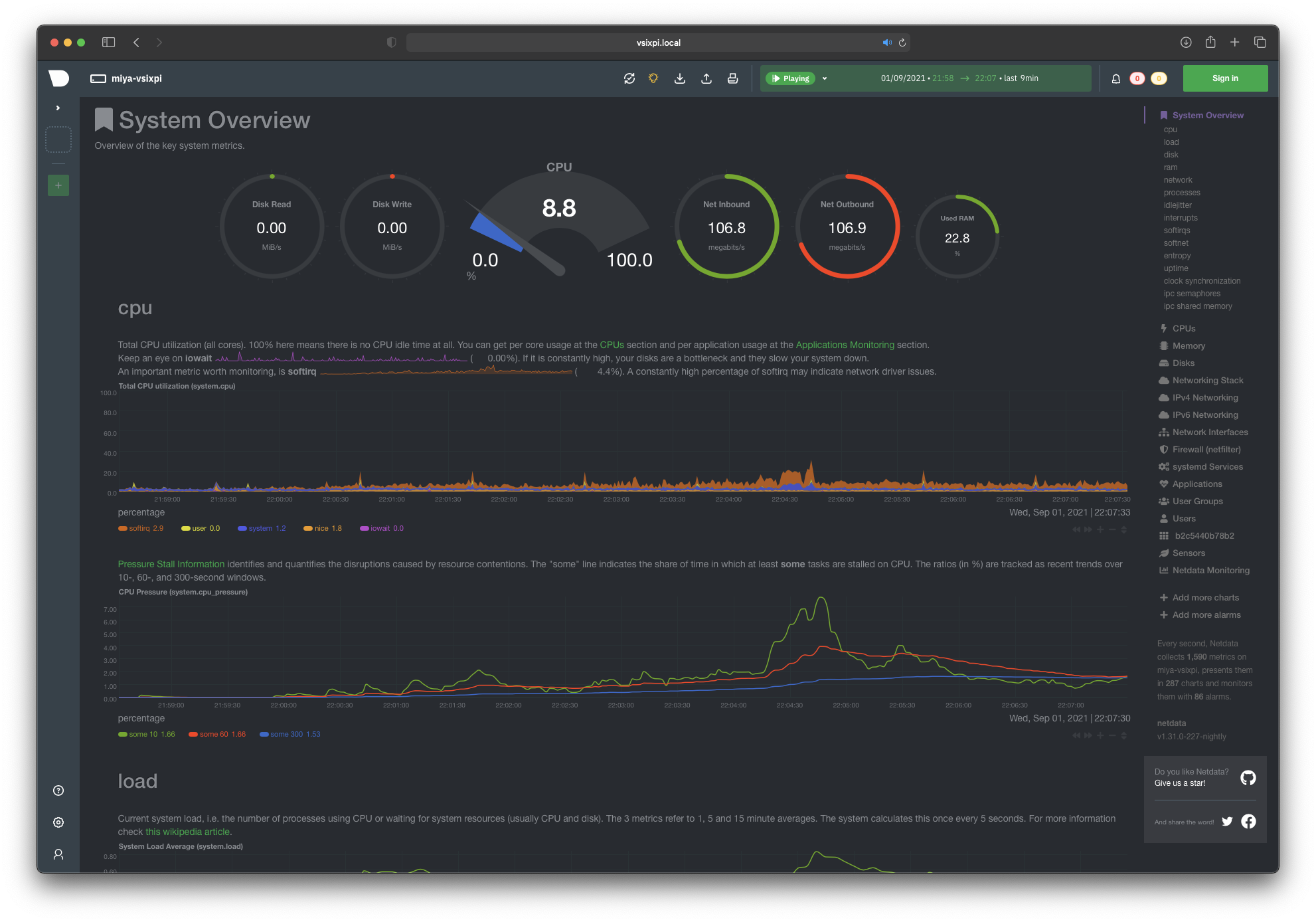 Open your favorite browser and go to http://vsixpi.local:19999 to see Netdata monitoring dashboard.