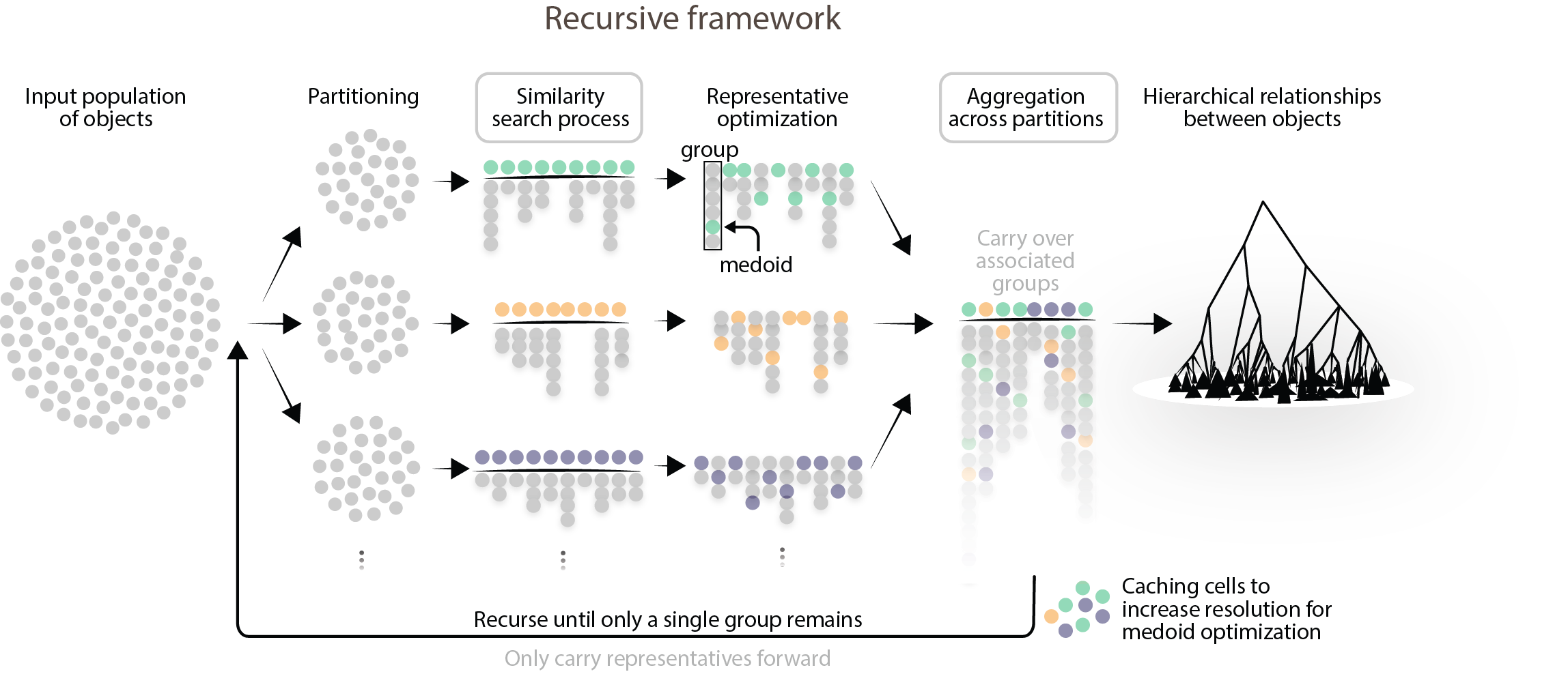 By carrying forward only representatives, this pipeline can be applied recursively to progressively merge groups according to the percentile-based similarity threshold. If allowed to run to completion, a global hierarchical structure is produced over the complete population.