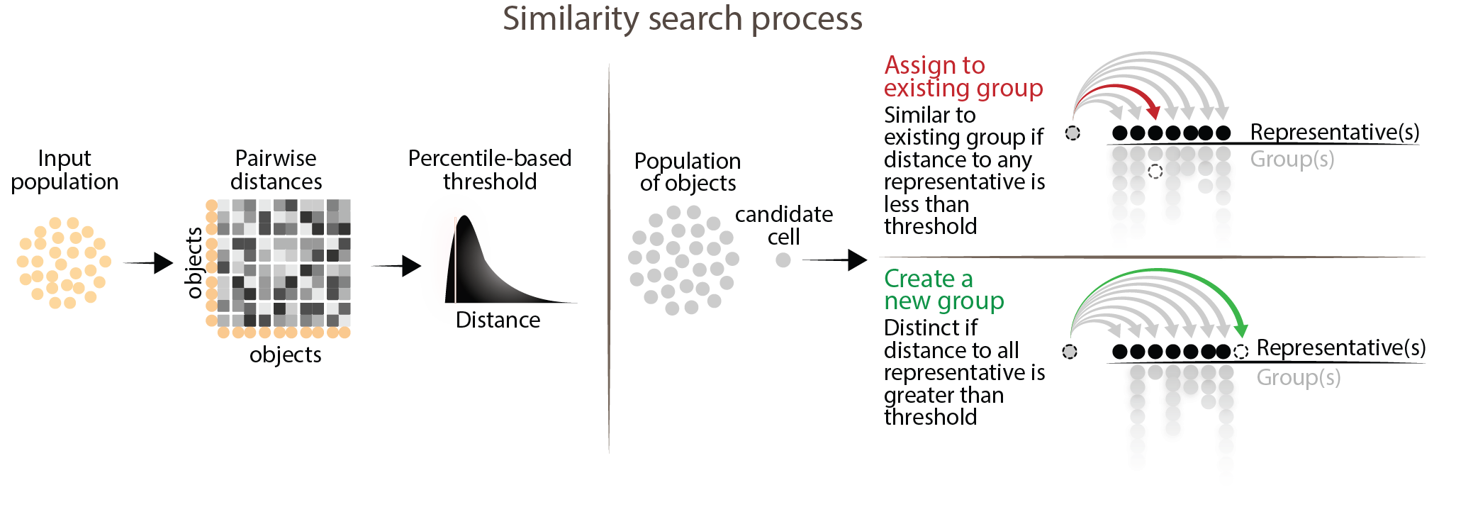 The main process of MILK involves grouping highly similar objects using a data-driven similarity threshold defined by a lower-tail percentile (e.g., 0.1%) of distances. In a single-pass through the dataset, each candidate object is compared to the representatives of existing groups. If the candidate has a distance below the threshold to any group, it is mapped to the group it is most similar to; otherwise, it is considered distinct, in which case it forms a new group and becomes its representative. The first candidate object forms a new group by default.