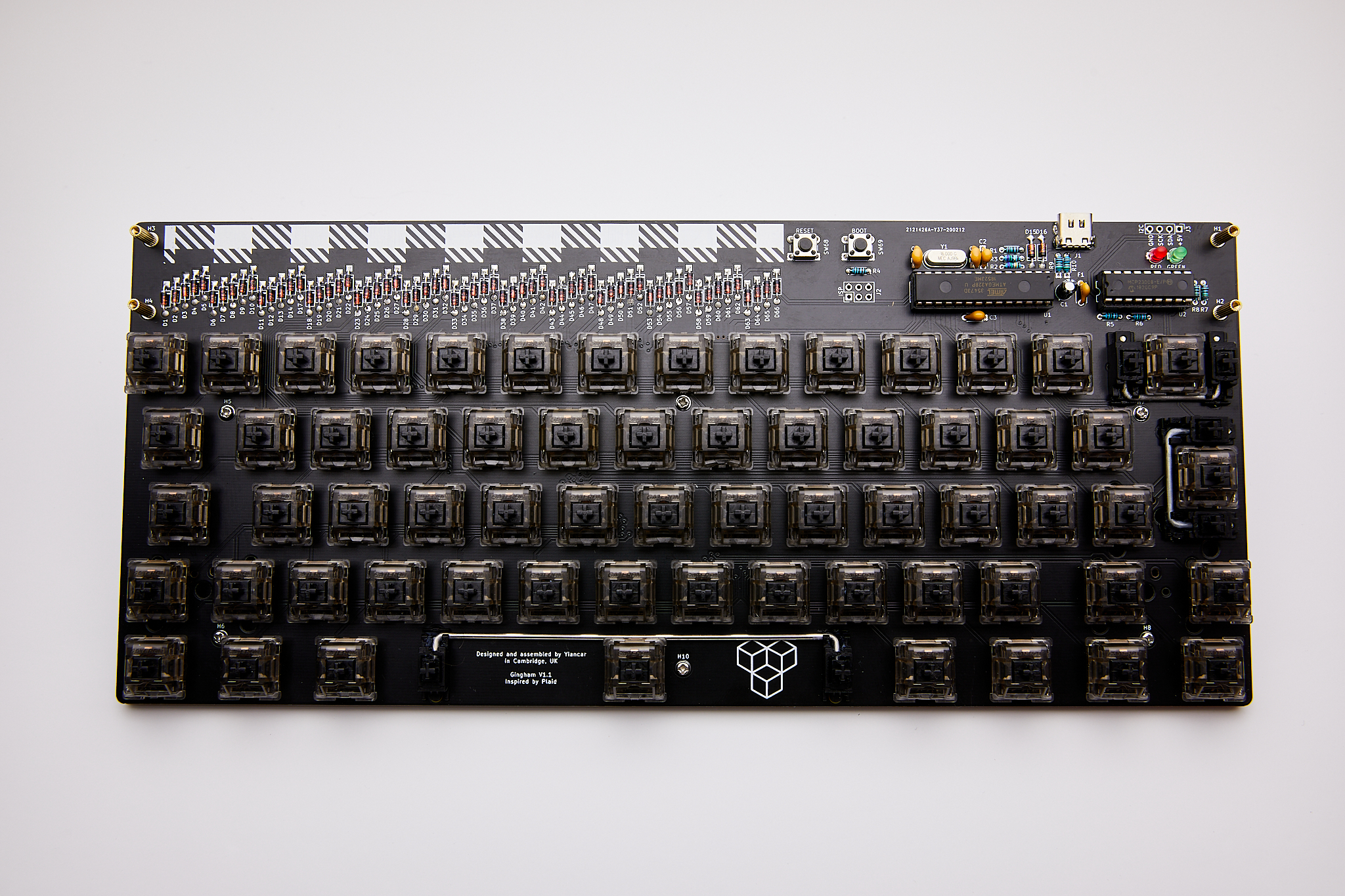 This ANSI/ISO keyboard kit is made using ONLY through hole components and inspired by the Plaid.